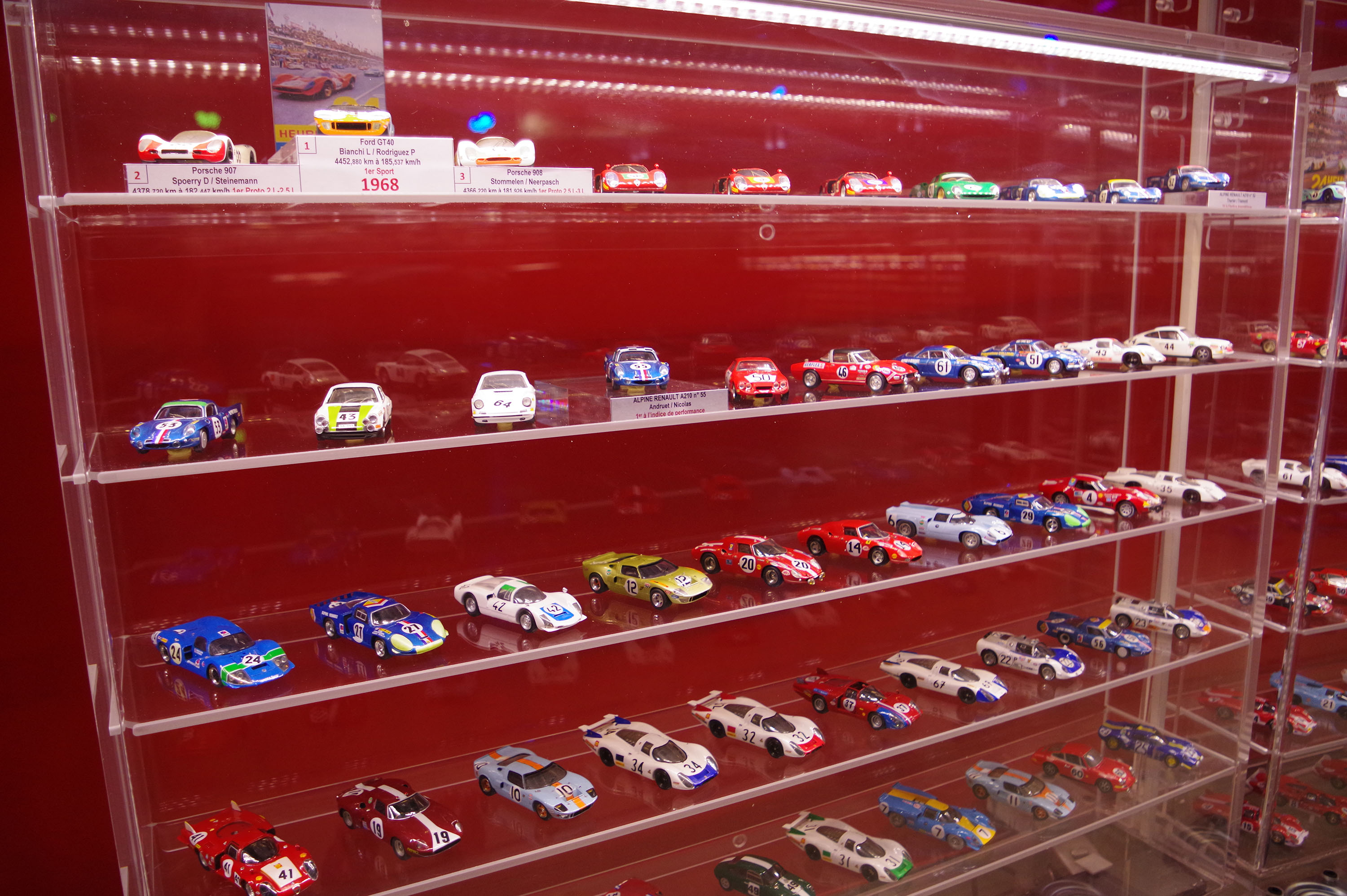 La grande rotonde centrale du Musée des 24 heures du Mans abrite la collection des 4300 voitures ayant pris part à la célèbre épreuve, à l’échelle 1/43 ème. De quoi ravir petits et grands. Les voitures sont soigneusement présentées, telle une mise en épis des célèbres départs type Le Mans entre 1925 et 1969. Classées dans l’ordre d’arrivée (15 classées seulement) ou d’abandon, avec même le podium des lauréates, les 54 miniatures sont d’une fidélité de reproduction exigeante. Un groupe de passionnés bénévoles veille à leur authenticité avec beaucoup de soin, scrutant les photos d’époque, reprenant les détails avec une minutie chirurgicale, recollant le moindre accessoire défaillant, reprenant une teinte jugée approximative. Ces grands enfants à la compétence historique indiscutable rêvent à travers ces jouets élevés au rang de témoins de leur histoire.